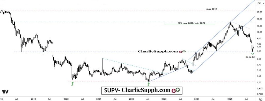 Hace tan solo unos días atrás te señalaba donde podía estar la zona que representaba su soporte de corto y su relevancia en este contexto: https://charliesupph.com/2025/09/19/supv-update-62/. Pues bien tras impactar y reconocer como tal el mismo el pasado Viernes, reacciono con extrema fortaleza durante la jornada de ayer, que hizo por momentos “olvidar” este triste 2025 para sus tenedores.()clickear para agrandar)