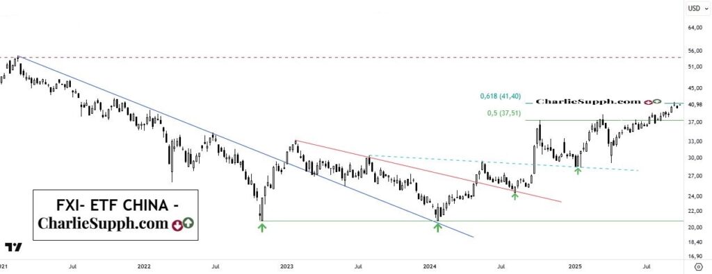 El principal ETF de las grandes empresas chinas o sea las de mayor capitalización bursátil se encuentra a falta de una sola jornada para concluir el mes( hoy )muy cerca de su máximo desde aquel doble piso del año 2024 y con claras chances de alcanzarlo en algún momento de la jornada que arranca en poco menos de dos horas. Con ello sigue merodeando su actual resistencia, en terminos base cierre semanal, me refiero al 61.8% de todo el recorrido declinante previo, algo que hace un tiempo atrás parecía una especie de utopia, mas que desde hace meses y meses y meses vengo señalando como objetivo primario. ( clickear para agrandar )