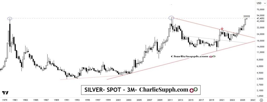 Tras mucho tiempo sin hacerlo y dado ha alcanzado una zona de altísima relevancia, muestro este chart de largo plazo, que hace foco en sus dos grandes picos a través de la historia el 1ero en los inicios del año 1980 y el ultimo hace ya 14 años atrás. Por lo tanto es realmente importante y es allí donde debe ponerse la lupa en esta instancia, me refiero al area comprendida entre 48/50 en terminos base cierre mensual. ( clickear para agrandar )