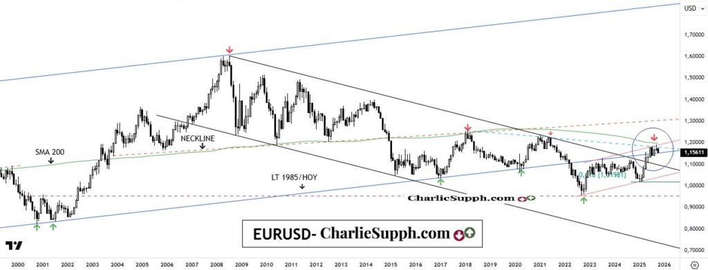 El par mas relevante del mundo forex y de mayor impacto en el DXY, el EURUSD, no ha podido superar las distintas resistencias que se detallan en la grafica adjunta y dentro de las cuales se destaca claramente el haber “arañado” la media móvil de 200 (m) y comenzó su corrección que alcanza el 1er soporte a poner a foco como lo es la linea tendencial ascendente con origen en el año 1985, o sea hace ya 40 años atrás. Solo de ser esta penetrada, no antes, la lupa se dirigiría y concentraría en el soporte extremo en esta instancia como lo es la linea superior del claro canal bajista en el cual se encontrara trabajando durante tantos años y que fuera quebrada unos 6(seis) meses atrás.
