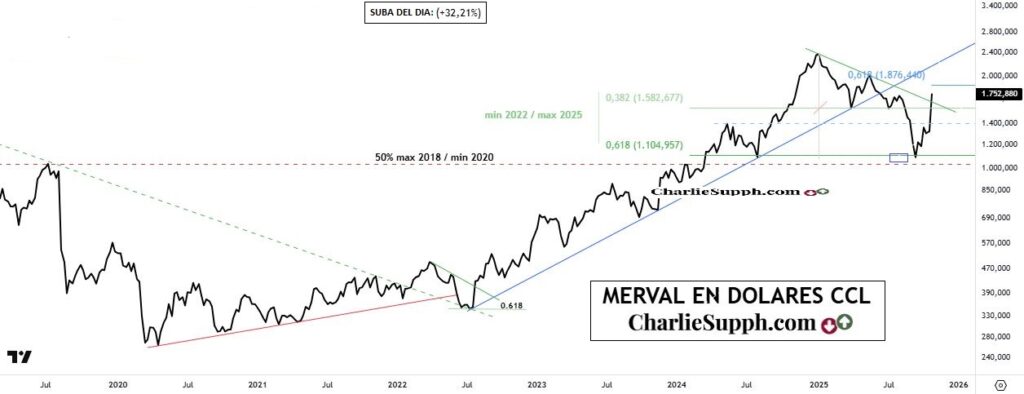 En un día histórico desde el punto de vista de la suba registrada en terminos porcentuales, este índice y en esta variante( dólares-ccl ) no tan solo pudo superar la resistencia apuntada en cada informe previo, me refiero a la zona comprendida entre 1410 /20, si no que la pulverizo absolutamente con lo cual prácticamente araño el 61.8% de todo el movimiento decreciente previo con origen en el inicio de este año, donde se encuentra el potencial escollo en esta instancia, si es que en el cierre de la semana puede quedar por encima de la tendencial declinante que nació en el máximo histórico de enero 2025(clickear para agrandar )