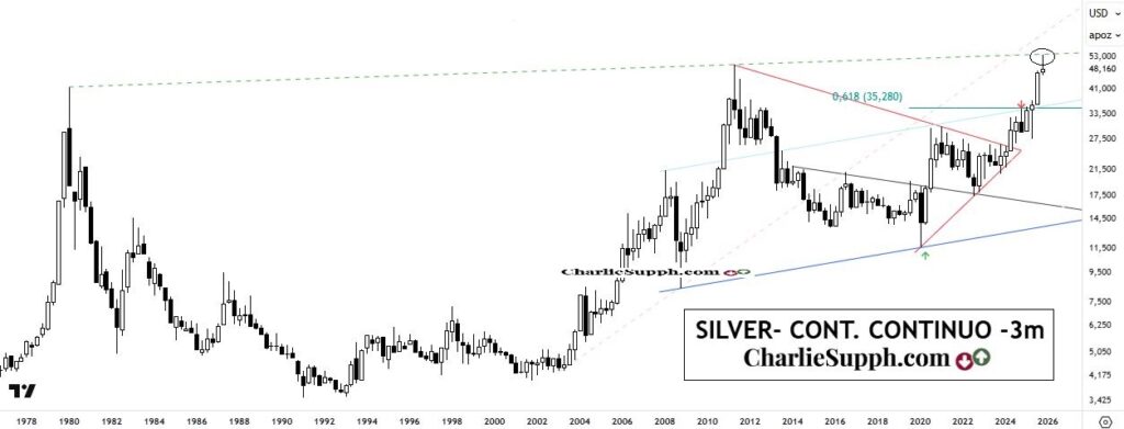 Ha cerrado un mes histórico para este commodity , dado ha podido generar un nuevo máximo luego de 14 años. Sin embargo el ultimo tramo de octubre si bien no empaña en absoluto su gran avance durante este 2025, enciende una luz amarilla en el camino, fundamentalmente desde que impactara la zona / linea de resistencia ya mostrada con anterioridad, en este caso analizada a través de un chart trimestral siendo allí donde debe estar el foco dada su altísima relevancia. ( clickear para agrandar )