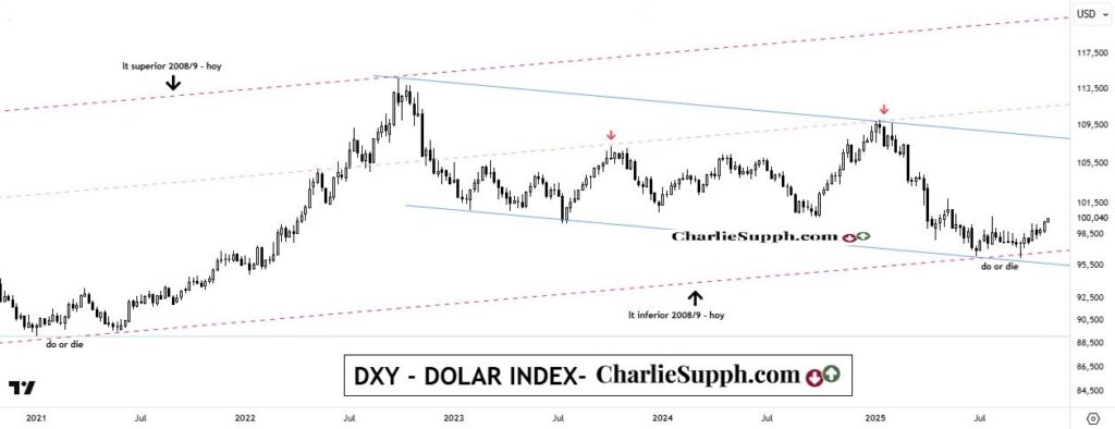 Hace ya mas de un mes atrás te mostraba como este índice, el principal del dólar a nivel mundial, impactaba en zona de soporte extremo: https://charliesupph.com/2025/09/18/dxy-dolar-index-update-160/. Hasta aquí el mismo no tan solo ha sido respetado, si no que en la mañana de hoy alcanza el máximo del ultimo tramo ascendente y ya esta marginalmente por encima de los 100 por 1era vez durante los pasados 3 meses.( clickear para agrandar)