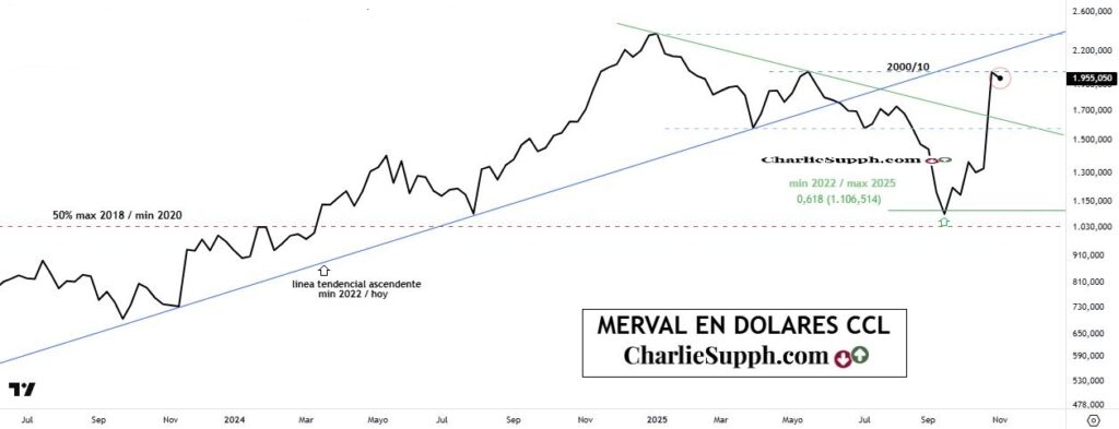 El principal índice bursátil de la Argentina en dólares/ccl cerro la semana con un merma del 2.6% respetando la 1era resistencia citada https://charliesupph.com/2025/11/04/merval-en-dolares-ccl-update-195/, me refiero a los 2000/2010 en termino base cierre semanal, que si bien por cierto no empaña en absoluto lo realizado durante la semana anterior, revierte una semana que también había arrancado de manera positiva. ( clickear para agrandar )
