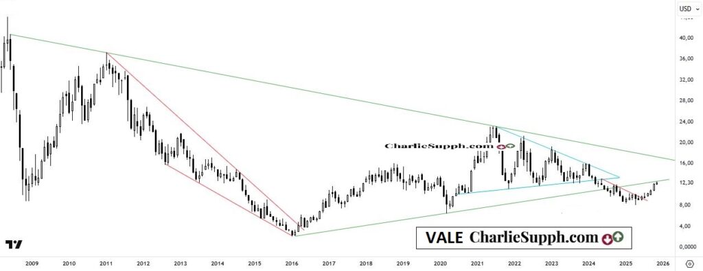Esta gran empresa brasileña continua recuperándose del tremendo palazo que recibiera durante los pasados 4 años y que durara hasta bien entrado este 2025, momento en el cual comenzara una buena recuperación que aun hoy perdura. Sin embargo ha alcanzado el 1er objetivo y potencial resistencia, como lo es la linea tendencial ascendente originada en aquel mínimo del año 2016 y que fuera penetrada hace poco mas de un año atrás. Es crucial para los bulls el poder quebrarla, dado eso sin dudas le daría un buen margen para seguir con el visible avance que ha tenido durante los pasados 6/7 meses (clickear para agrandar )