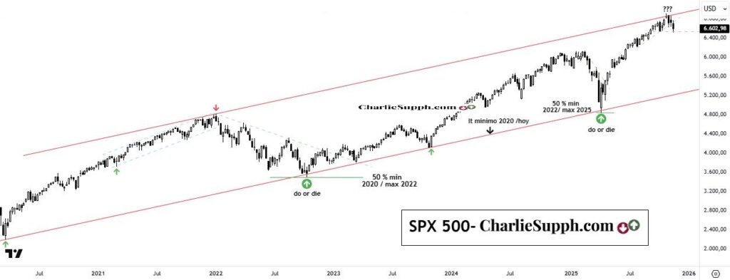 Tercera semana consecutiva de merma para el benchmark natural del mundo bursátil, el SPX500, que incluyo penetrar el 1er gran soporte apuntadohttps://charliesupph.com/2025/11/14/spx-500-update-258/. Tras ello, fue en busqueda de su siguiente soporte, en este caso estático(el anterior era el dinámico) el cual alcanzo e incluso penetro marginalmente, los 6550 ptos, mas pudo finalmente quedar por encima de este, en el base cierre semanal que es donde debe estar el foco la semana entrante dada su relevancia en esta instancia.( clickear para agrandar )
