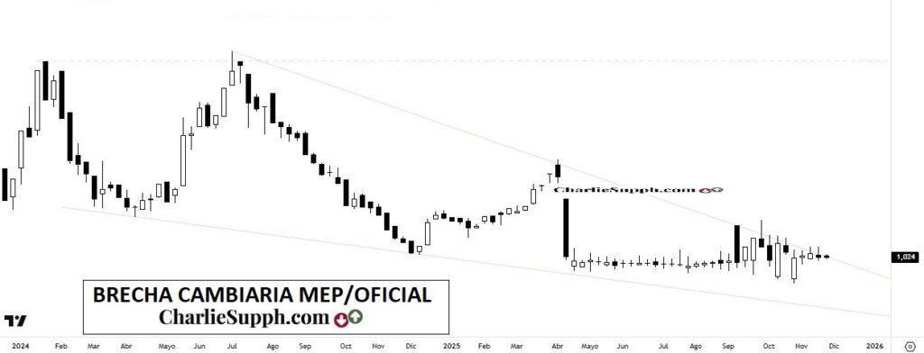 La denominada brecha cambiaria continua merodeando la linea que representa en el hoy su 1era gran resistencia , me refiero a aquella que se originara en su ultimo pico que data de Julio del año 2024 la cual sin duda es la que hay que poner en foco en esta instancia en terminos base cierre semanal.( clickear para agrandar )