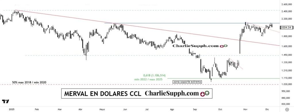Tal lo expresado en la jornada del viernes en el pre market, el principal índice bursátil de la Argentina en su variante dólares/ccl alcanzo una zona de relevancia en materia de potencial resistencia dado se metió de lleno en el area donde freno las ultimas veces que llego a la misma, tal lo refleja la grafica adjunta y por ende donde tiene que ponerse la lupa en esta instancia.( clickear para agrandar )