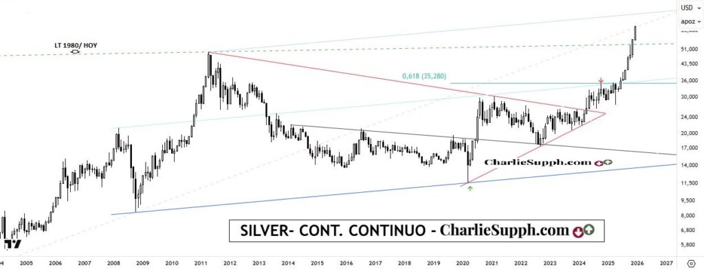 Notable mes tiene hasta aquí este commodity que alcanza en esta mañana un nuevo record alejándose aun mas de la resistencia apuntada https://charliesupph.com/2025/11/02/silver-cont-continuo-update-79/ me refiero a la linea que une sus máximos anteriores( 1980 y 2011 ), que queda ahora como soporte ante eventuales pullbacks. Esto ha posibilitado estrechar al mínimo la distancia con el siguiente objetivo, el cual detallo en la grafica adjunta y de superarlo ir eventualmente a la linea superior del potencial mega canal ascendente en desarrollo. IMPRESIONANTE! ( clickear para agrandar )