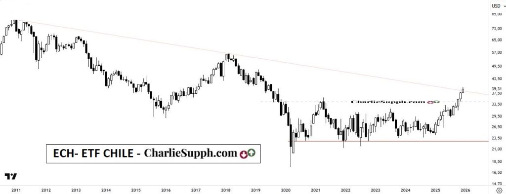Este etf, el principal de Chile en los EEUU, genero en los últimos días un nuevo máximo durante este brillante 2025, siendo este un valor no visto desde el año 2019. A su vez ha podido superar la linea tendencial declinante originada en aquel pico del año 2011, la cual es crucial para los bulls dado de poder materializarlo en terminos base cierre mensual seria una nueva puerta abierta para sus tenedores de cara al mediato. ( clickear para agrandar )
