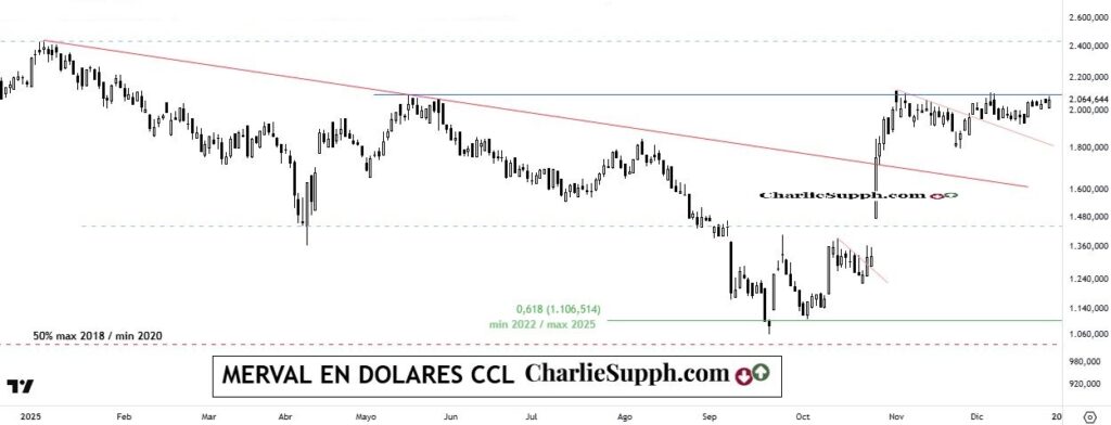 El Merval en esta variante(DOLARES-CCL ) se mantiene ligeramente por debajo de la resistencia a superar, siendo esta el area donde freno las ultimas veces que llego a la misma, tal lo refleja la grafica adjunta y por ende donde tiene que ponerse la lupa en esta instancia. La misma gira en torno a los 2100, en terminos base cierre semanal, tenelo en cuenta. ( clickear para agrandar )