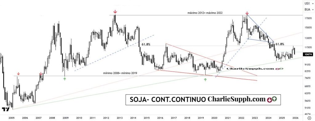 Tras lo que que fue alcanzar su siguiente objetivo/escollo, me refiero al viejo 61.8% de todo el movimiento alcista previo este commodity entro en corrección y tuvo un saldo negativo durante el pasado mes de Diciembre que incluyo quedar por debajo del 1er potencial soporte, con lo cual estrecho la distancia con su soporte extremo en el hoy, la tendencial ascendente originada en el año 2005.( clickear para agrandar )