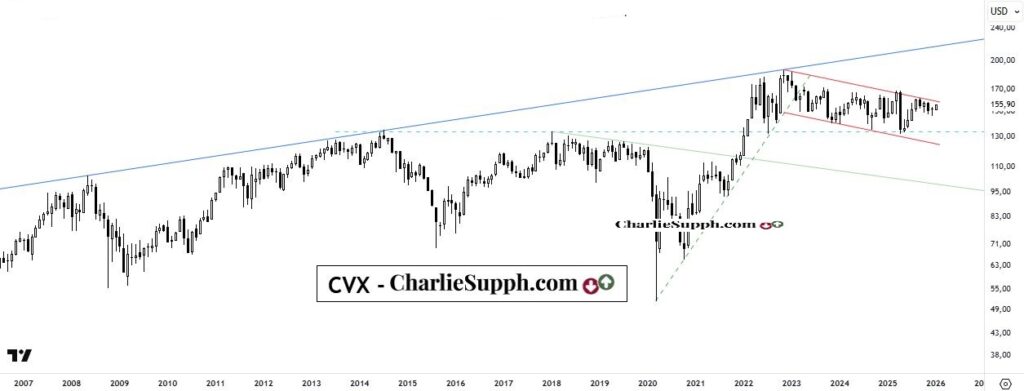 Mucha atención en el arranque de la semana con algunos de los principales exponentes del mundo petrolero de cara a lo que sucedido/ puede suceder en Venezuela. Tal el caso de CHEVRON, uno de los gigantes a nivel mundial del sector energético el cual ha reaccionado en buena forma desde que impactara y respetara en Abril pasado el soporte extremo que guarda directa con aquellos picos que se registraran en los años 2014 y 2017 y el piso del año 2022 o bien la linea inferior de la potencial bull flag en desarrollo. Sin embargo su gran escollo, continua siendo la linea superior de la citada bull flag , la cual hoy podría ser testeada e incluso superada de cara a lo que esta aconteciendo ( clickear para agrandar)