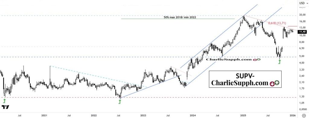 SUPV, el mas chico de los bancos argentos cotizantes en NY, CONTINUA sin poder quebrar la tendencial declinante originada en su máximo de ENERO de este 2025, su gran resistencia en esta instancia, que de ser finalmente superada ( no antes ) pondría el foco en el 61.8% de recorte de todo el movimiento declinante previo, su gran divisor de aguas de cara al mediato.(clickear para agrandar )