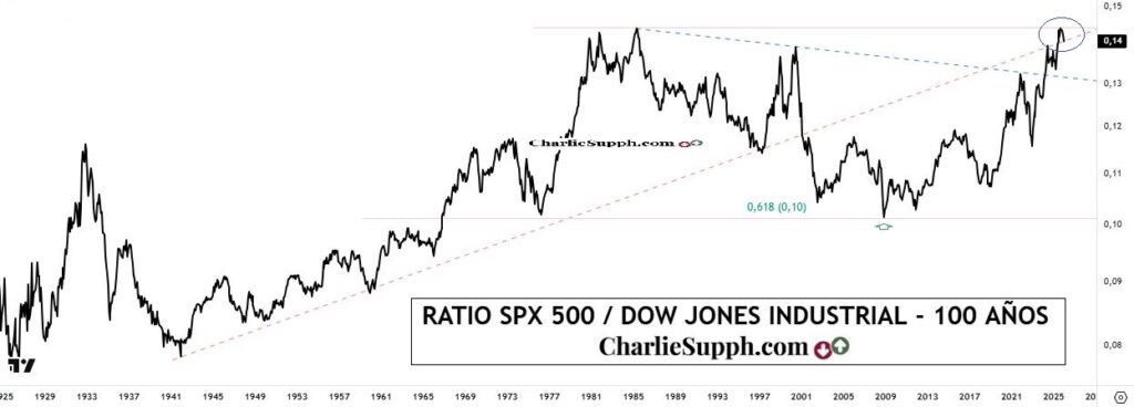 Dado los analice de manera individual anteriormente, vuelvo a mostrar el RATIO entre el SPX 500 y el DJI, el cual sigue trabajando en cercano a maximos históricos, aunque de momento ha reconocido la resitencia que guarda relacion directa con ese pico que se viera hace unos 40 años atrás y por lo tanto es claramente allí donde debe estar el foco sin duda alguna en caso de nueva reaccion. Por el lado de abajo impacta en zona de soporte intermedio, tal se detalla en la figura adjunta, representada por la linea tendencial ascendente originada 85 anos atras.( clickear para agrandar)
