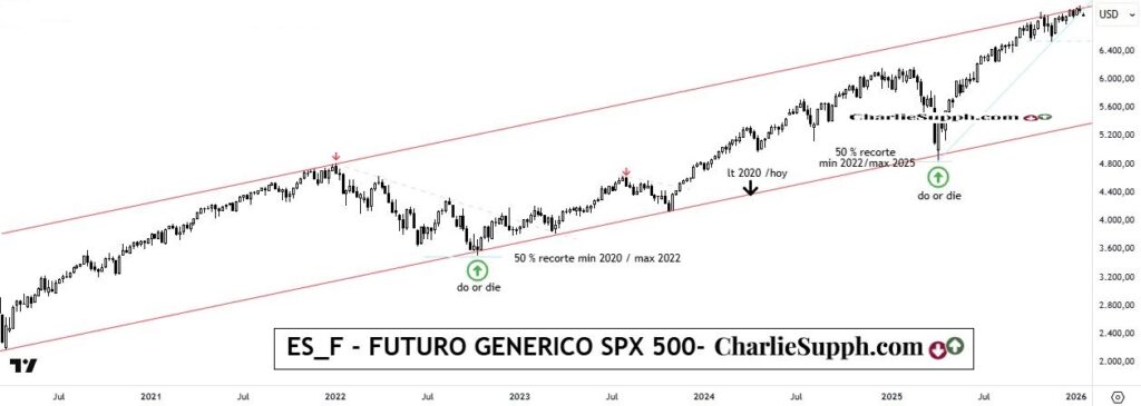 Si bien hoy es feriado en los EEUU( día de M.L.KING ), si operan sus futuros y estos están cayendo pesadamente a esta hora ( 9.05am ). El principal indicador y benchmark bursátil mundial , tiene un merma superior al 1% en dicha variante y penetra en el inicio de la semana el 1er gran soporte apuntado, la linea tendencial ascendente con origen en Abril del año 2025, lo cual significa que mas allá de haber hecho nuevos máximos durante las ultimas jornadas, ha vuelto a respetar su mas importante resistencia de mediano plazo y que ya te apuntara en reportes previos https://charliesupph.com/2026/01/16/es_f-contrato-continuo-spx-500-update-5/, me refiero a la linea superior del claro canal ascendente con origen en el año 2020. ( clickear para agrandar )