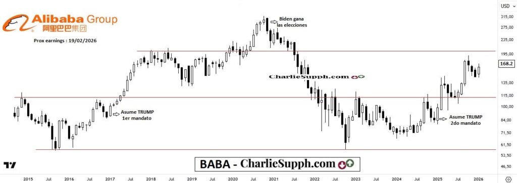 Durante las ultimas semanas te mostré este gigante del e-commerce chino en su variante adr y en su variante cedear, destacando en ambas oportunidades el buen momento del activo y su posibilidad concreta de crecimiento de cara al mediato. Vuelvo en esta oportunidad SOBRE la historia completa en su formato adrs, o sea su cotización en los EEUU, donde queda aun mas claro lo apuntado, dejando la puerta abierta a un eventual testeo de su próximo gran objetivo en tornos a los 200/05, el cual si bien luce muy ambicioso, no debería descartarse. ( clickear para agrandar )