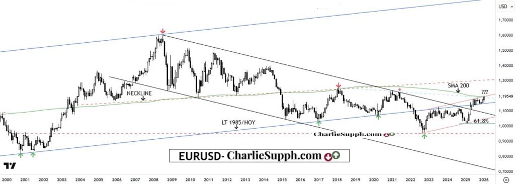 El par mas relevante del mundo forex y de mayor impacto en el DXY, el EURUSD, alcanzo de manera milimétrica su gran objetivo , esto es en 1er lugar la sma de 200 mensual y tal puede verse en la figura adjunta las otras dos líneas relevantes en esta instancia: 1, la linea superior del canal ascendente de corto plazo 2, la linea que une sus últimos máximos. Dicho esto, la zona impactada podría constituirse en la resistencia mas importante para este par, en términos base cierre mensual y por lo tanto debería tenerse en cuenta, mas allá de flojedad que ha tenido el dólar de meses a la fecha. ( clickear para agrandar )
