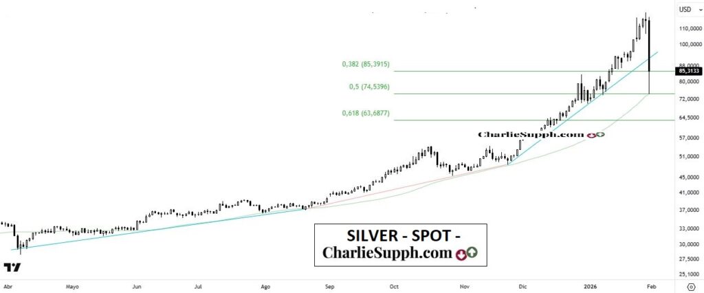 Un día histórico se vivió en este commodity el pasado Viernes dado que en tan solo una jornada BARRIO con la utilidad de prácticamente un mes entero, poniendo de manifiesto y de manera concreta eso que te apuntara en varios reportes previos en cuanto al movimiento parabólico en el cual podía encontrarse. Te dejo un ejemplo de hace unos días atrás: https://charliesupph.com/2026/01/23/silver-cont-continuo-update-87/ Lo cierto es que en tan solo una jornada recorto el 50 % de todo el movimiento ascendente registrado desde Abril del año 2025, donde aparecieron finalmente compradores, haciendo que sobre el cierre del día levantara su precio , el cual concluyo en torno al 38.2% de recorte del movimiento antes apuntado. Lógicamente es muy posible que la volatilidad imperante continúe al menos por unos días y en ese sentido es importante que mantenga ante eventuales pullback el mínimo alcanzado, el cual coincide con relevante la media móvil divisoria. ( clickear para agrandar)