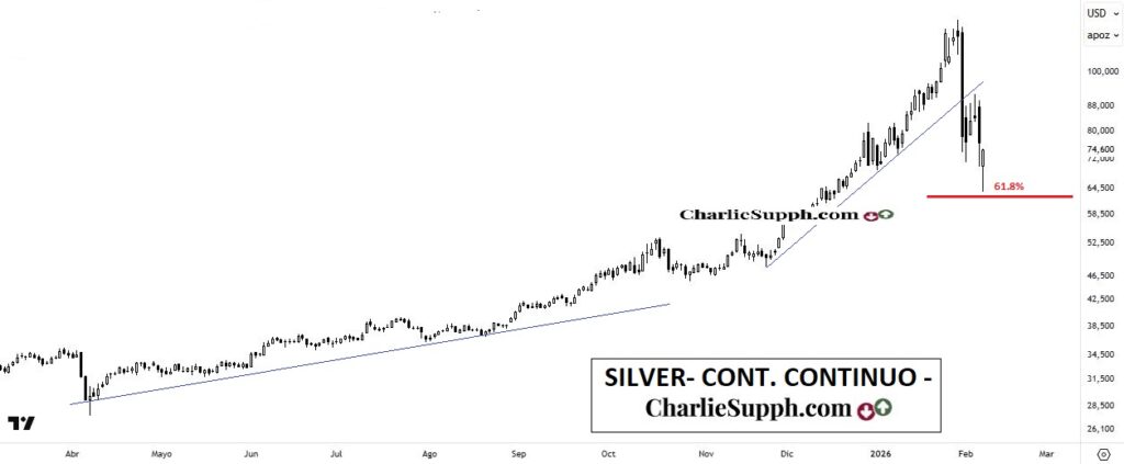 Un overnight con muchísimo movimiento ha tenido la plata, siendo esta una situación que aun perdura a esta hora de la mañana ( 9.40 am ), ya que ha ido en busqueda de su soporte extremo en el hoy, me refiero al 61.8 % de todo el recorrido ascendente desde aquel mínimo de Abril del año 2025 y desde allí ha reaccionado de manera importante ya que ha podido subir +/- 10 dólares en pocas horas. Por lo tanto la volatilidad implícita continua vigente, situación alertada en los últimos reportes , incluyendo el de corto plazo analizado en la jornada de ayer : https://charliesupph.com/2026/02/05/silver-contrato-continuo-update-7/. Dado lo señalado, es vital que los bulls mantengan vivo el soporte apuntado ante eventuales pullbacks . ( clickear para agrandar ).