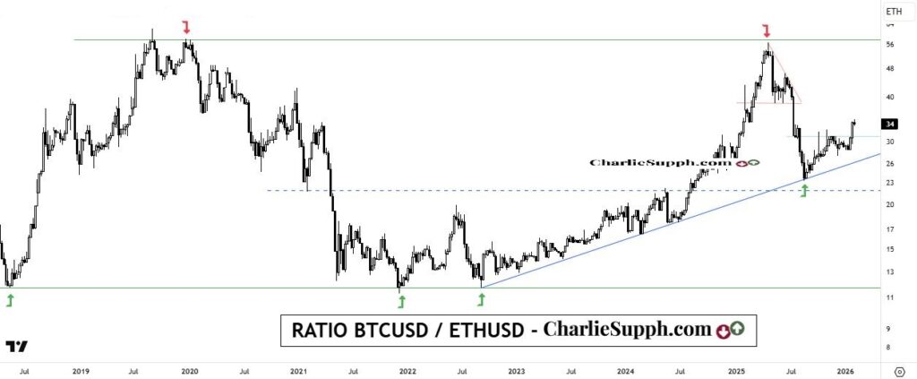 Si bien los dos han caído pesadamente durante los últimos meses hasta hace un par de días atrás, ha sido el Bitcoin el que se ha comportado mejor en el relativo entra ambos desde que este Ratio impactara y respetara el soporte extremo que fuera apuntado exactamente hace casi 6 meses atrás tras la mayor corrección en este ratio en años: https://charliesupph.com/2025/08/29/ratio-btcusd-ethusd-update-26/ y eso ha incluido el poder posicionarse por encima de su 1er escollo, en este caso estático, el cual queda ahora como soporte en caso de pullbacks.( clickear para agrandar )
