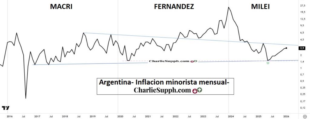 Antes de continuar analizando otros bancos argentos, me gustaría hacer referencia al relevante dato conocido ayer por la tarde, me refiero a la inflación en Argentina, la cual araño el 3%, siendo el valor mas alto en meses. Algo ha quedado en claro tras el 2.9% mensual que conocimos ayer y es que desde hace poco mas de 9 años no ha habido un solo mes con esa marca por debajo del 1% y claramente en el grueso de las veces ha sido holgadamente por encima de la misma. ( clickear para agrandar )