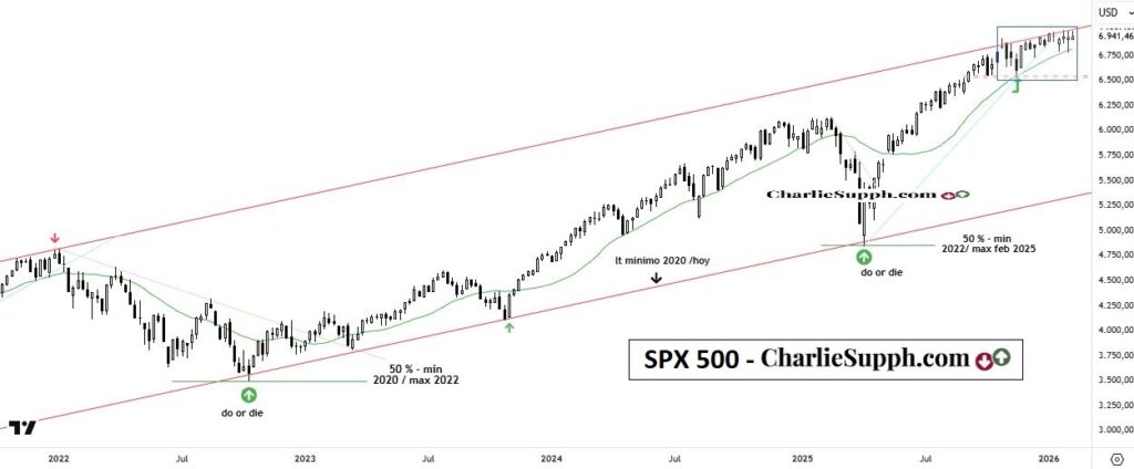 Antes que comience formalmente la rueda de hoy, hago foco una vez mas en el SPX 500, el benchmark natural del mundo bursátil, ya que como vengo apuntando de semanas y semanas a la fecha se sigue manteniendo por debajo de su gran resistencia en el hoy, en términos base cierre semanal, como lo es la linea superior del claro canal ascendente de mediano plazo en el cual se encuentra trabajando desde hace varios años. Y si bien continua bien cerca de la misma, aun no logra posicionarse por encima de esta, generando una especie de caja ( MARCADO CON UN RECTANGULO EN LA GRAFICA ) dentro de la cual va y viene, mas no define tendencia aun. ( clickear para agrandar )