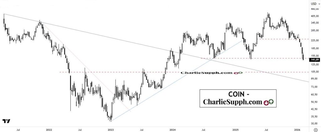 Y dado me metí en el informe anterior con el mundo cripto que mejor que analizar a esta empresa: Coinbase que es una de las grandes plataformas de comercio de criptomonedas y por lo tanto se ha claramente perjudicado con la caída que estas han experimentado en general de meses a la fecha. Mas aun alcanza una zona de altísima relevancia, dado se trata ni mas ni menos de su soporte extremo en términos base cierre semanal y por lo tanto es crucial su cierre de hoy. Como si eso fuera poco, presento ayer en el after su balance y de momento se encuentra con una suba de un 4% en el pre market a esta hora de la mañana ( 8.45am ). ( clickear para agrandar )