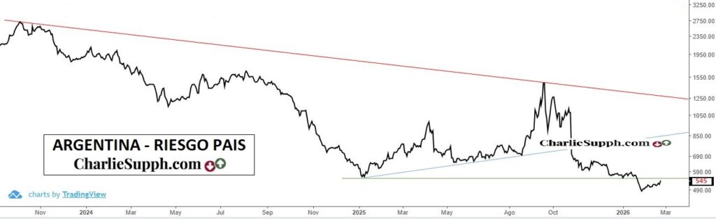 El denominado riesgo pais argentino ALCANZA su valor mas alto durante estos últimos días con lo cual estrecha la distancia que lo separa de su resistencia en el hoy, la cual es sin dudas el mínimo previo. Por lo tanto el foco debe estar allí, en torno a 550/560 en términos base cierre semanal dada su relevancia y por ende lo tendría en cuenta. ( clickear para agrandar )