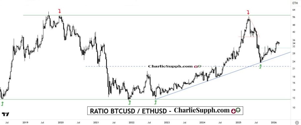Si bien los dos han caído pesadamente desde sus máximos y hasta hace un mes atrás, ha sido el Bitcoin el que se ha comportado mejor en el relativo entra ambos desde que este Ratio impactara y respetara el soporte extremo que fuera apuntado exactamente hace casi 7 meses atrás tras la mayor corrección en este ratio en años: https://charliesupph.com/2025/08/29/ratio-btcusd-ethusd-update-26/ y eso ha incluido el poder posicionarse por encima de su 1er escollo, en este caso estático, el cual queda ahora como soporte en caso de pullbacks.( clickear para agrandar )