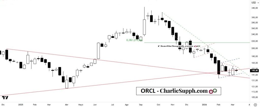 ORCL, uno de los grandes del sector software, presento en el after de ayer su balance , el cual supero holgadamente las expectativas del mercado y cotiza a esta hora ( 8.45am ) en el pre market con una suba en torno al 10 % en relacion a su cierre de la jornada de ayer. Con ello y de mantenerse así( vital obviamente ), continua con el proceso de reacción comenzado unas pocas semanas atrás la dura caída que comenzara unos 6 meses atrás, situación que te he ido mostrando aquí en reiteradas ocasiones. MAS AUN, estaría superando la relevante linea tendencial declinante, su gran resistencia de corto, lo cual es crucial para los bulls para poder ir en busqueda del próximo potencial objetivo en torno a los 173/175, el cual también es fundamental quebrar para las aspiraciones de sus tenedores de cara al mediato. ( clickear para agrandar )