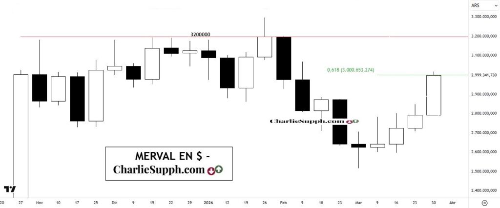 Este índice en su variante natural, $, concluyo esta corta semana NUEVAMENTE en positivo y por lo tanto prolongo el buen momento en el mismo durante los pasados 25/30 días. Sin embargo alcanzo el 1er gran termómetro en esta instancia o sea su 1er gran escollo a superar representado por el 61.8% de todo el movimiento declinante previo por lo que allí debe estar el foco cuando se reanuden las operaciones la semana entrante. ( clickear para agrandar )