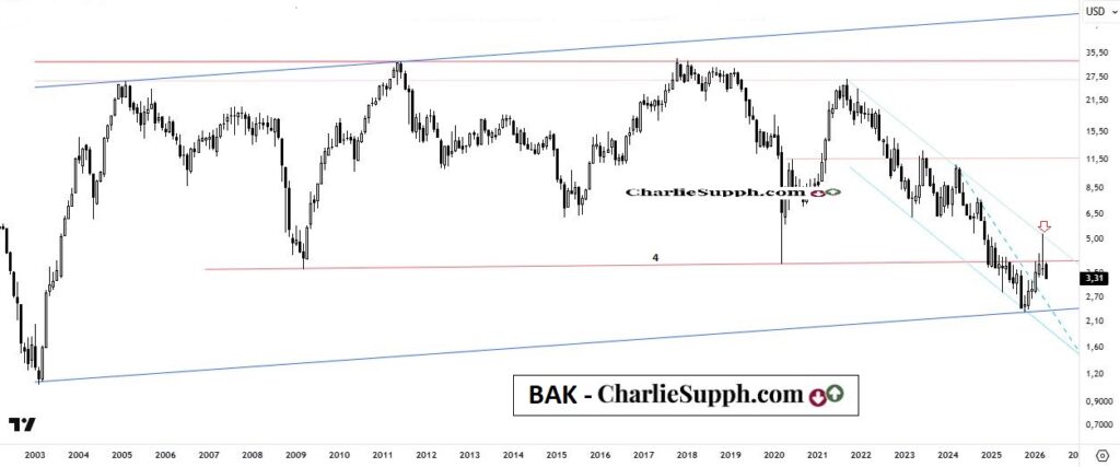 Una volatilidad inusitada ha adoptado esta especie brasilera durante los pasados 45 días, lapso en el cual sus inversores pasaron de la euforia a una nueva decepción , ya que durante el mes de MARZO y en intra lograron posicionarse en primera instancia por encima de los 4 dólares apuntados tiempo atrás como el 1er gran escollo a superar https://charliesupph.com/2026/02/18/bak-update-3/ y luego impactaron en su siguiente resistencia, la linea superior del canal declinante que detallo en la grafica adjunta. Mas eso no pudo ser mantenido en términos base cierre mensual, entrando en fuerte corrección lo cual ha incluido arrancar este mes de ABRIL por debajo de los 4 dólares y momento con fuerte presión vendedora. ( clickear para agrandar )