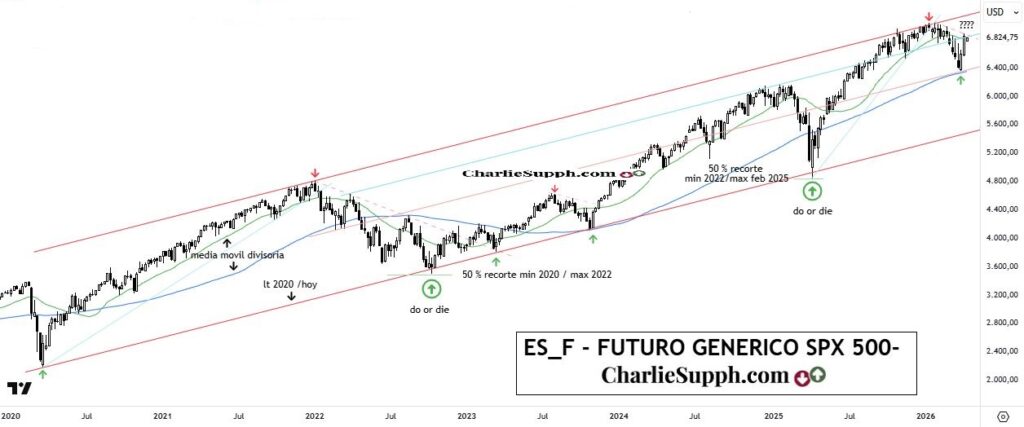 Este índice y en esta variante ( futuro ) baja en el pre open ( -0.5 % siendo las 8.50am ahora ) e incluso llego a superar el 1% en el overnight y lo que esta en juego es la media móvil divisoria mas corta y que detallo una vez mas en la grafica adjunta. La otra media que marco es la mas larga y que es su actual soporte extremo y que actuó como tal un par de semana atrás. En ambos casos , lo expresado es en términos base cierre semanal. Solo de superar la resistencia citada y de la manera apuntada, a lo que habría que agregar la tendencial declinante originada en el máximo, los bulls estarían listos para un eventual nuevo ataque a su máximo ( NO ANTES, claramente ) ( clickear para agrandar )