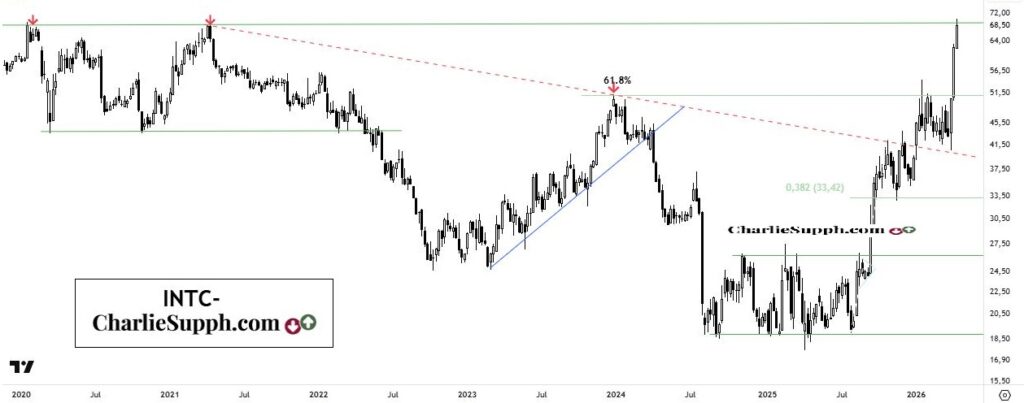Y si los índices de los EEUU han vuelto en su mayoría a nuevos máximos, obviamente hay una cantidad de especies que se han volado literalmente durante los pasados 20 días. Un caso muy representativo de ello es INTC, que tras su impacto en zona de soporte : https://charliesupph.com/2026/03/31/intc-update-55/, reacciono de manera notable y eso ha incluido ya no solo superar la resistencia que fuera apuntada , me refiero al 61.8% de toda la caída previa, si no que ha podido alcanzar de manera milimétrica sus máximos anteriores, donde esta el foco en el hoy dada su altísima relevancia en materia de potencial resistencia extrema en términos base cierre.( clickear para agrandar )