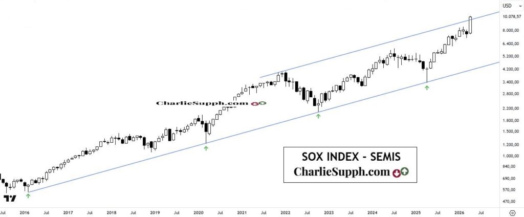 El Sox, el principal índice de los semiconductores, tiene hasta aquí una histórica semana y con ello un sensacional Abril, al menos hasta aquí, que incluye superar( en intra ) la resistencia que fuera señalada tan solo un puñado de días atrás : https://charliesupph.com/2026/04/18/sox-index-semis-update-44/. Con ello, solo resta saber como concluirá el mes y si finalmente la linea superior del canal ascendente que se detalla será quebrada en dichos términos .( clickear para agrandar )
