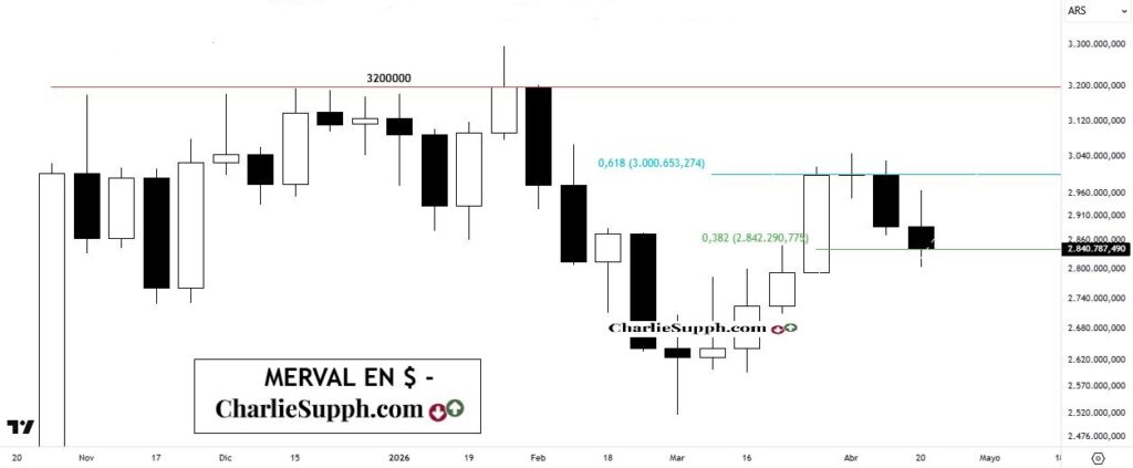 La semana concluyo en baja para este índice en su variante natural, o sea $ y con esto aun reconoce la resistencia apuntada tres semanas atrás : https://charliesupph.com/2026/04/02/merval-en-update-182/, me refiero al 61.8% de recorte de todo el movimiento declinante previo, expresado en términos base cierre semanal, que es lo que los bulls necesitan supera para poder ir por mas ( NO ANTES ). Acaso lo único “festejable” por parte de los comprados sea el haber mantenido hasta aquí el 38.2% del impulso visto en Marzo pasado, primer soporte que debe ser respetado para no seguir cayendo. ( clickear para agrandar )
