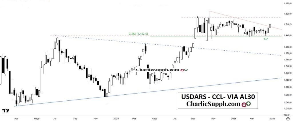 Una situación similar a la antes analizada se refleja en esta variante (dólar ccl via Al30 ), ya que finalmente y tras mantener el soporte apuntadohttps://charliesupph.com/2026/04/25/usdars-ccl-via-al30-update-6/ esta superando el escollo representado por la tendencial declinante, que representa su 1era resistencia a superar, en términos base cierre semanal, alcanzando al igual que en el caso previo un valor no visto en mas de 60/70 días.( clickear para agrandar )