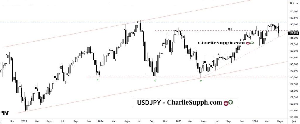 En un contexto en el cual cada vez con mas insistencia se habla de un potencial mega estimulo por parte del gobierno japonés( o acaso haya sucedido hoy mismo), esta la 2da moneda en importancia dentro del DXY retrocede fuertemente, algo que ha hecho cada vez que el gobierno japonés pasa a la practica o bien se especula que eso puede suceder. Lo cierto y concreto que hasta aquí, esa situación suele dura poco y tal es así que en esta ocasión lo hace desde el ultimo máximo que se viera unas jornadas atrás y de momento respeta lo que es su actual soporte, me refiero a la linea tendencial con origen hace exactamente un año atrás. (clickear para agrandar )