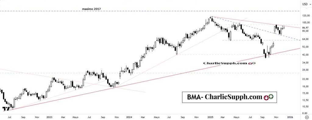 En el inicio de la semana te mostraba como los bancos argentos cotizantes en NY pudieron finalmente reaccionar tras tanto palo previo: https://charliesupph.com/2025/09/23/supv-update-63/. Sin embargo, durante la jornada de ayer tuvieron un pullback relevante que te muestro a continuación tomado a BBAR como ejemplo. La pregunta que emerge como obvia es si lo visto en el 1er tramo de la semana es una simple reacción/recorte a la dura caída previa, pero que tiene o tendrá una vida limitada o se trata de algo mas importante y de fondo. De momento, en mi opinion aun no puedo descartar la 1er hipótesis y por lo tanto estoy con el foco en el desarrollo del movimiento comenzado el pasado lunes.( clickear para agrandar )