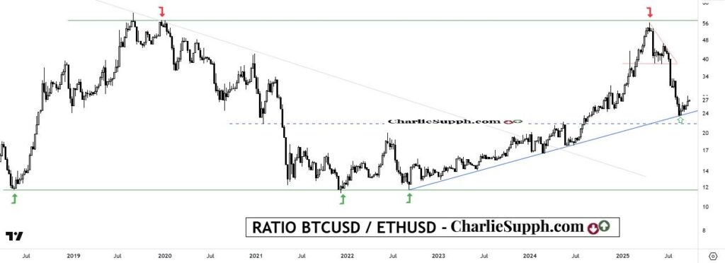 El soporte extremo que fuera apuntado exactamente hace un mes atrás tras la mayor corrección en este ratio en años: https://charliesupph.com/2025/08/29/ratio-btcusd-ethusd-update-26/ funciono hasta aquí como tal y desde esa instancia ha podido reaccionar un tanto recortando parte de toda la caída previa. Solo de ser penetrada la linea ascendente que representa dicho soporte, no antes, uno podría pensar en una caída adicional que alcance su soporte estático el cual queda detallado en la grafica.( clickear para agrandar )