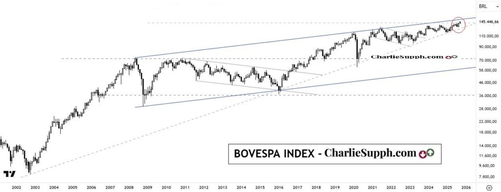El principal índice de Brasil, el Bovespa, alcanzo un nuevo máximo durante la ultima semana, con lo cual consolida un buen 2025, al menos hasta aquí. Por lo expresado estrecha la distancia con la linea superior del canal ascendente en el cual se encuentra hace años, el cual representa, en terminos base cierre mensual, el gran objetivo bull de mediano plazo. (clickear para agrandar )