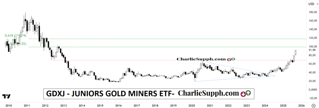 Este etf , que nuclea lo mas selecto del mundo aurífero en su versión Junior alcanza el maximo de este 2025 y con ello estrecha aun mas la distancia que lo separa de su 1er objetivo en esta instancia, como lo es el 50 % de todo el recorrido declinante previo, que coincide con el ultimo pico que se viere en el año 2012.( clickear para agrandar)